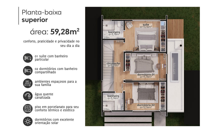 Uma obra-prima de design e elegância, com acabamentos impecáveis que elevam o estilo de vida a novos patamares. Proporcionando conforto, privacidade e facilidade. Cada casa possui duas suítes, com um visual perfeito para relaxamento e intimidade. Uma ampla cozinha conjugada com sala de estar e jantar com churrasqueira, lavabo, área de lavanderia com acesso externo e interno e estacionamento privativo. As casas ainda possuem espera para água quente, ar condicionado, amplas aberturas para iluminação natural e ventilação, persianas automatizadas, espera para lareira entre outras praticidades, para proporcionar toda a funcionabilidade e conforto necessário em sua morada.